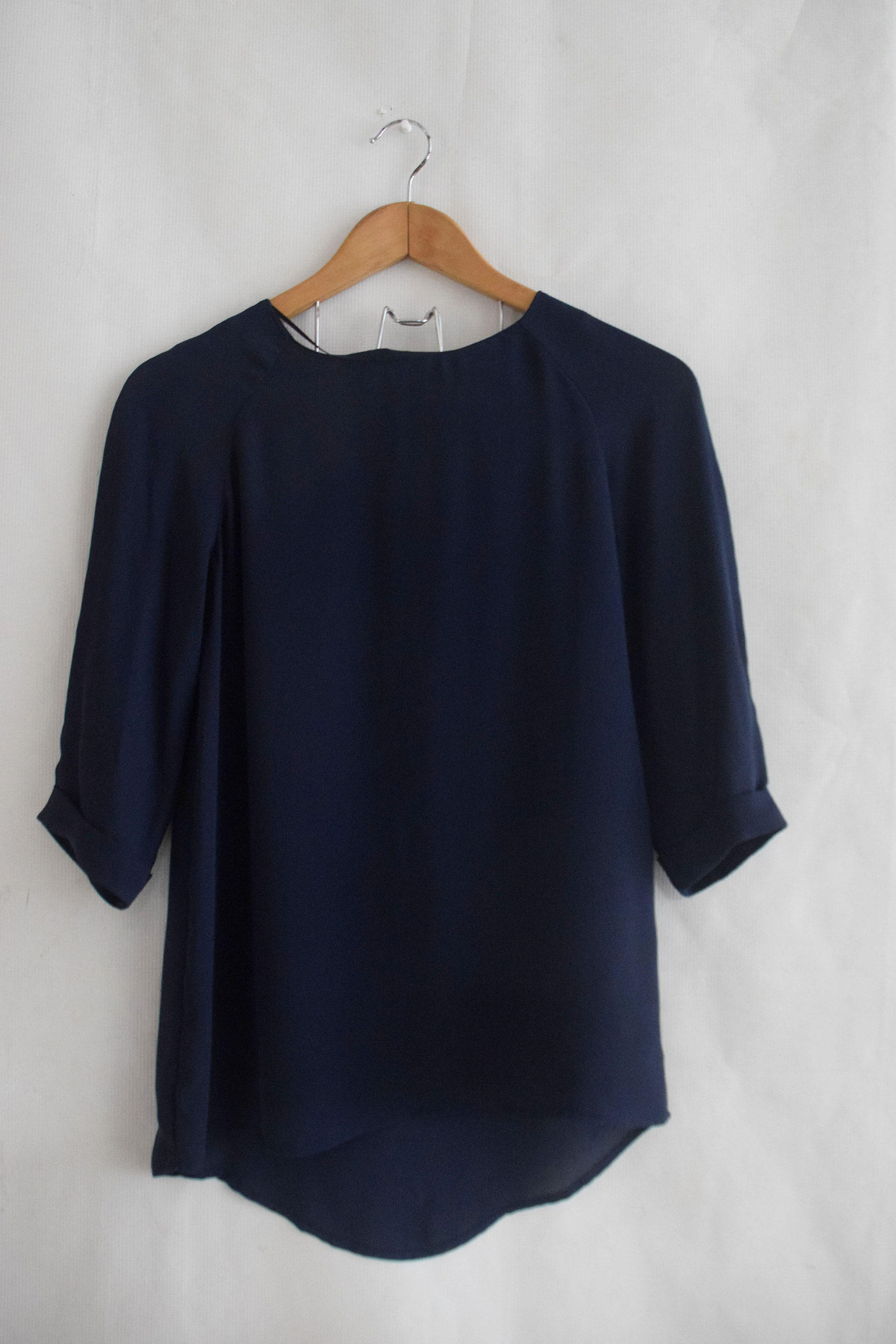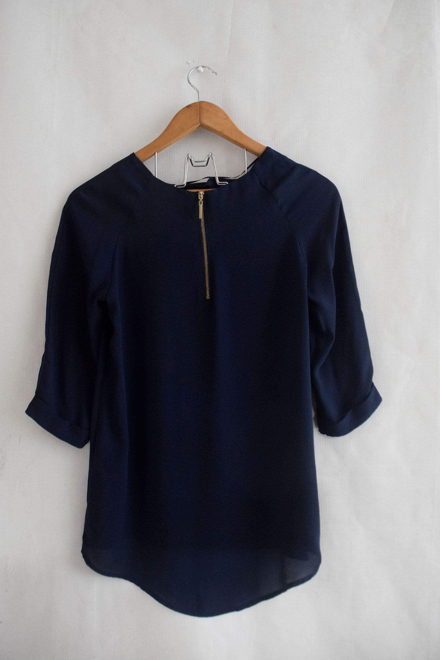 ATMOSPHERE / Lady’s navy blue top with folded elbow arm sleeve & gold back zip, size M