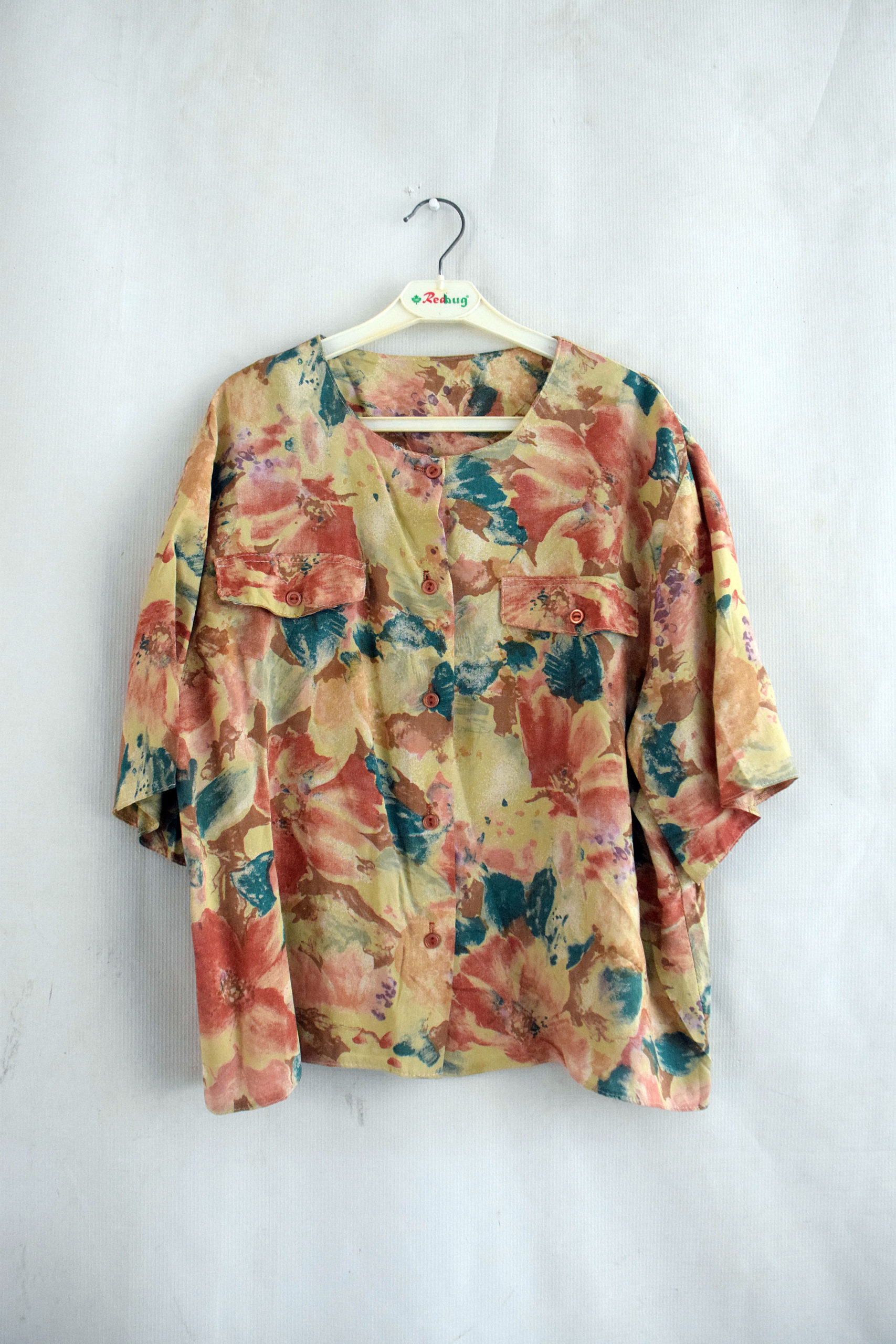 Yellow short sleeve, botton up top, orange & green flower design